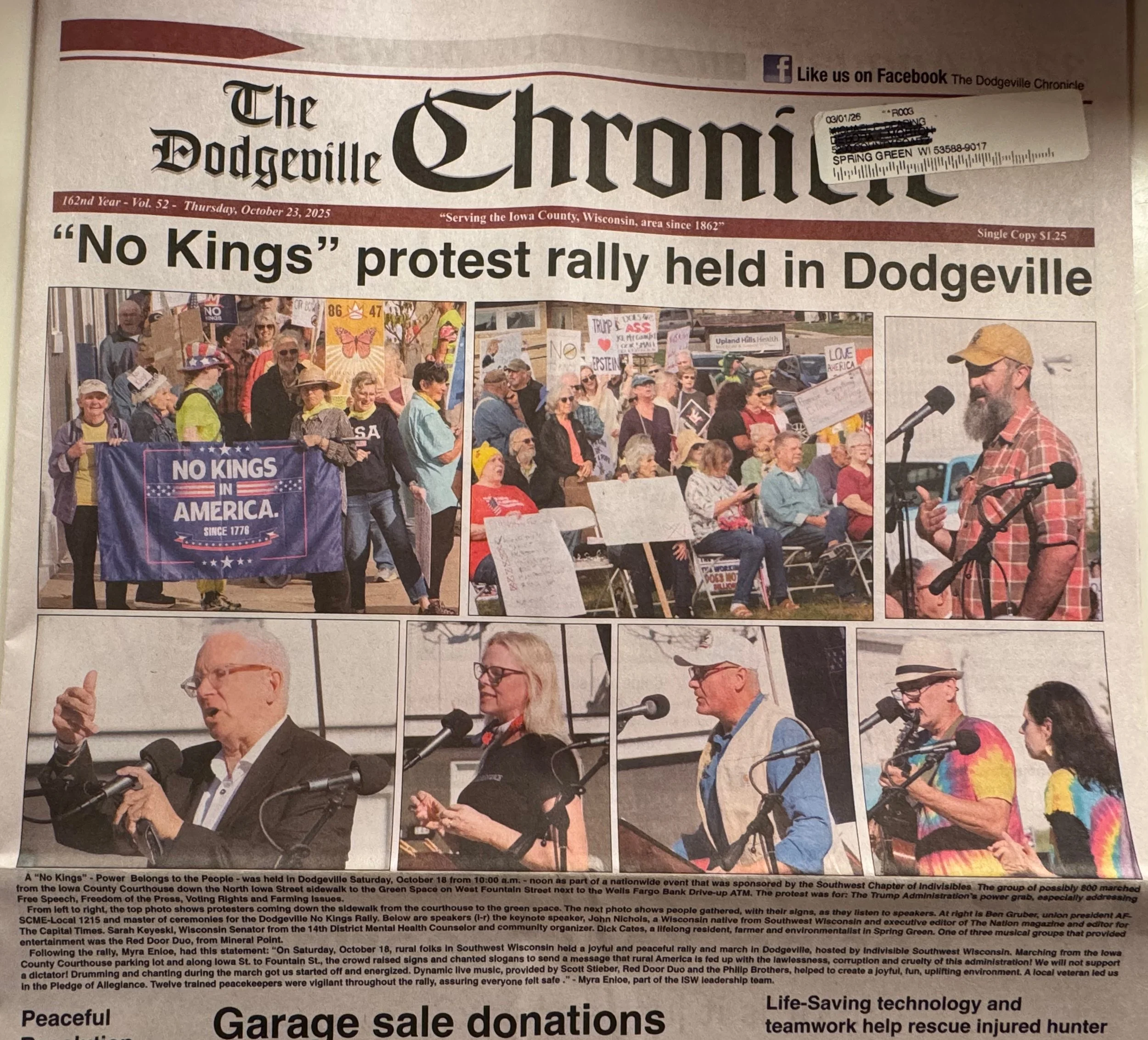 October 18th No Kings Organized Rally Dodgeville 900 participants